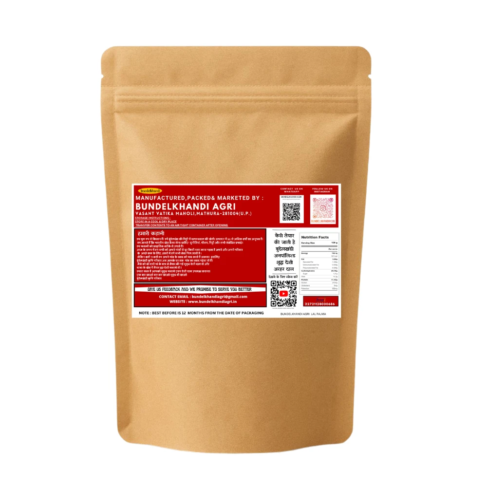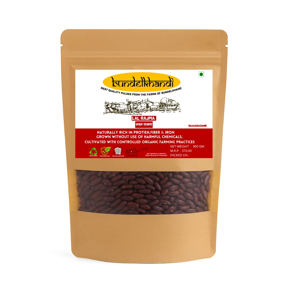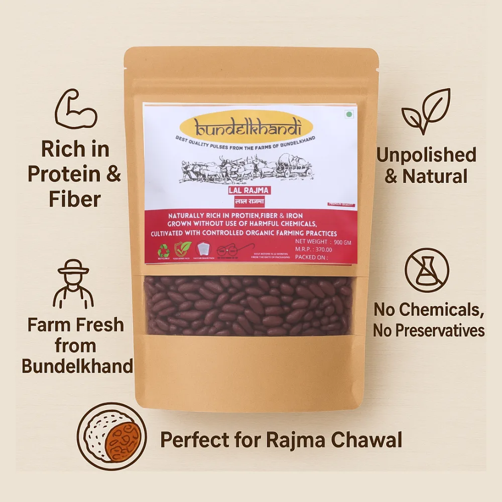 Bundelkhandi Red Rajma (900g) is a premium variety of kidney beans sourced from the rich lands of Bundelkhand. Naturally grown and carefully selected, these beans are rich in protein, fiber, and essential minerals. Known for their rich taste and creamy texture, they are perfect for preparing authentic rajma curry, stews, and healthy recipes. Unpolished and chemical-free, they are hygienically packed to retain freshness, with a 12-month shelf life for purity and flavor.